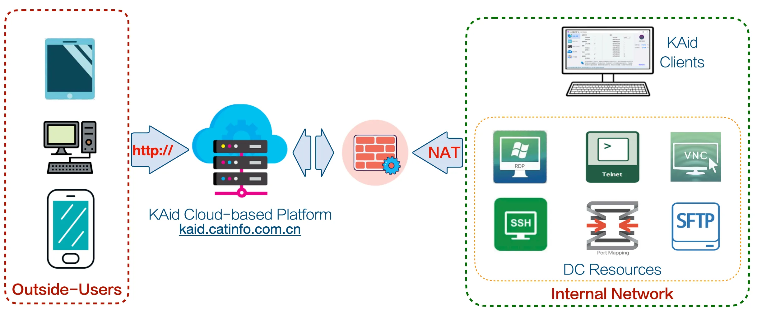 KAID использует публичную облачную платформу, устраняя необходимость обслуживания традиционных VPN-подключений, позволяя пользователям быстро и безопасно подключаться к внутренней сети через веб-интерфейс.