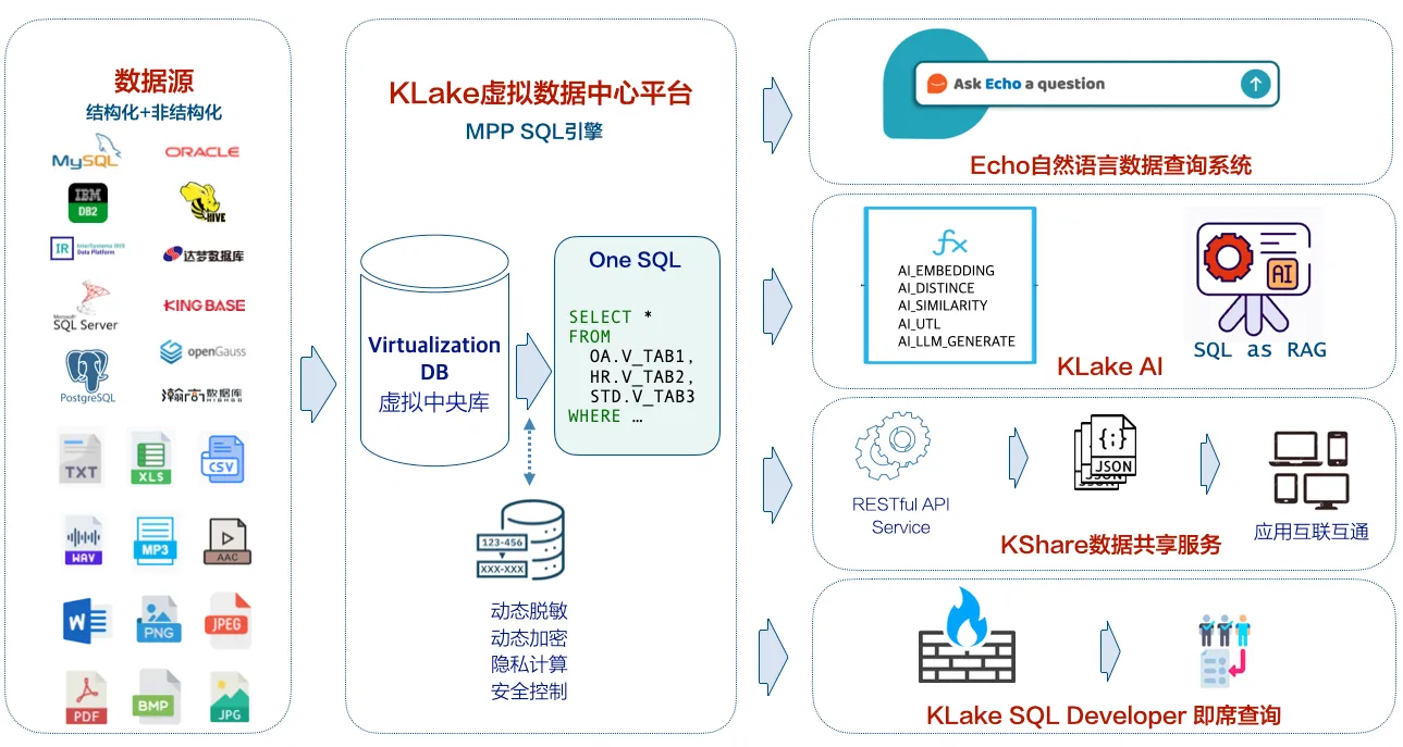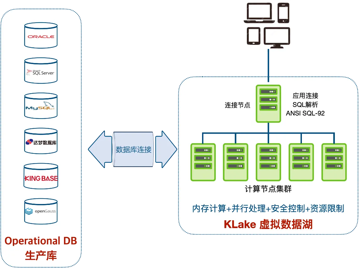 KLake — это SQL-вычислительный кластер на основе MPP (массово-параллельной обработки). Он не хранит данные, а динамически разбирает/выполняет SQL-запросы и возвращает результаты. Платформа предоставляет централизованное управление безопасностью и ресурсами